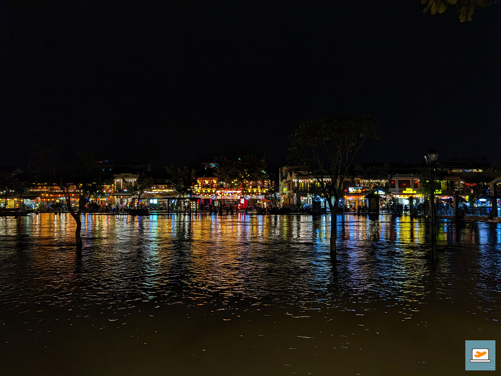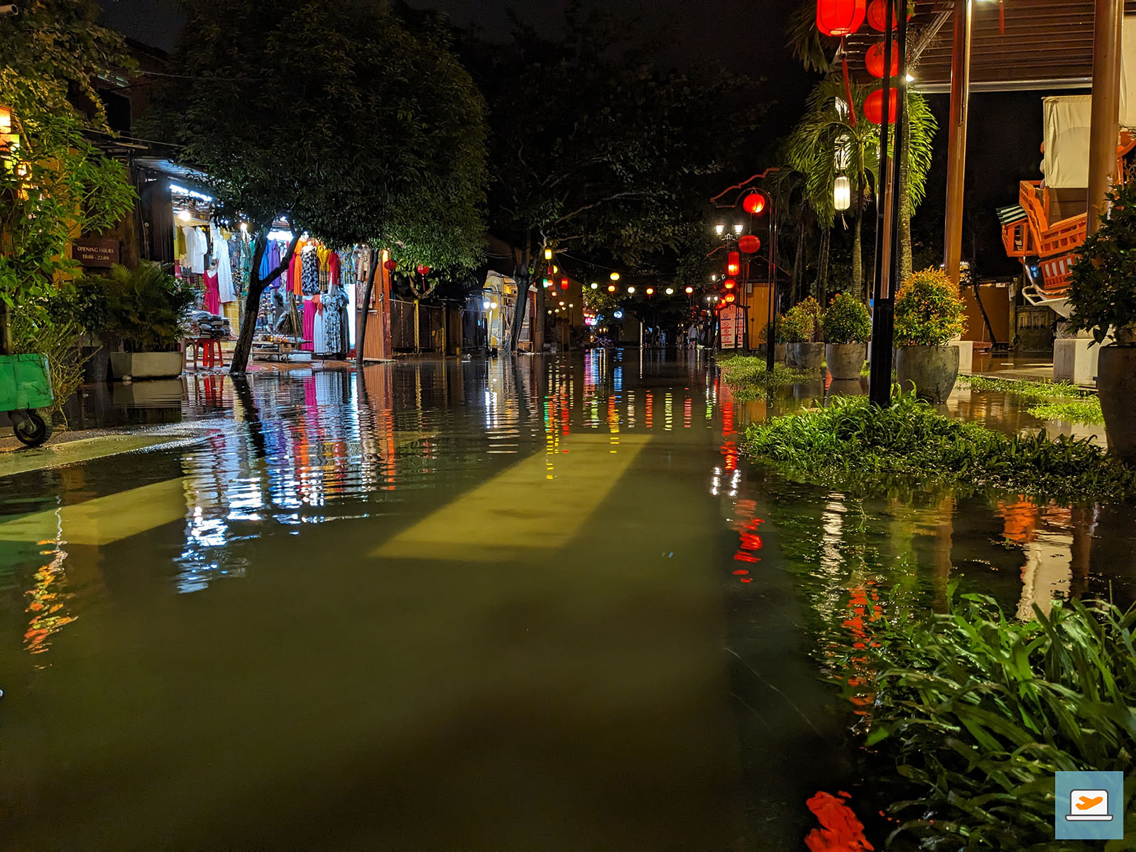 Damit im Portemonnaie und einer lokalen SIM-Karte ausgestattet (am Flughafen habe ich das irgendwie verpeilt) ging es nun in das Stadtzentrum, welches zu meiner Überraschung ein wenig überflutet war. Und ein wenig ist gut: Ein Teil der Altstadt liegt auf einer Insel inmitten des Thu Bồn River und ohne nasse Füße zu bekommen, konnte man diese Insel nicht erreichen. Aber auch Teile der Straßen des Teils auf dem Festland standen unter Wasser.