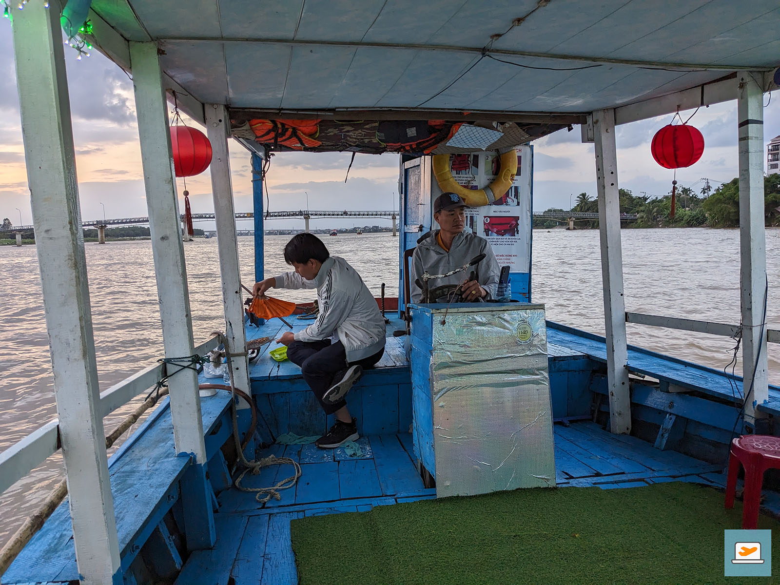 Nach der Erkundung der Anlage, die in der fast schon privaten Tour mit lediglich einem weiteren Paar und insgesamt sehr wenigen Reisenden vor Ort sehr angenehm war, ging es zum Abend noch auf ein kleines Boot, mit dem wir uns wieder zurück nach Hội An machten. Auf diesem Boot wurde ein kleines BBQ organisiert, welches wirklich sehr süß war und neben einigen Fisch- und Fleischspießen auch angebratenes Gemüse und einen Reislikör beinhaltete, der nicht nur gute Umdrehungen hatte, sondern auch noch ziemlich gut schmeckte und ein gelungener Abschluss des Tages war…