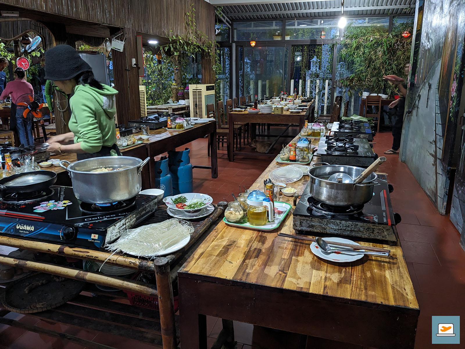 Im Kochunterricht selber konnten wir uns an vielen Bestandteilen der vietnamesischen Küche austoben und diese am Ende selbstverständlich auch essen. So entstand im Laufe des Abends selbst hergestelltes Reispapier für unfassbar leckere Sommerrollen, aber auch Frühlingsrollen, gefüllte Reispfannkuchen (Bánh xèo), ein leckerer Salat und ein gegrillter Fisch in Bananenblättern standen auf der Speisekarte. Ein bisschen Show, wie das Spiel mit dem heißen Öl in der Pfanne am Feuer, durfte dabei natürlich nicht fehlen und nach dem mehr als nur leckeren (wie oft habe ich das Wort in diesem Absatz verwendet? 😀 ) Abendessen bekamen alle Teilnehmer noch ein digitales Kochbuch mit allen Rezepten zugeschickt.