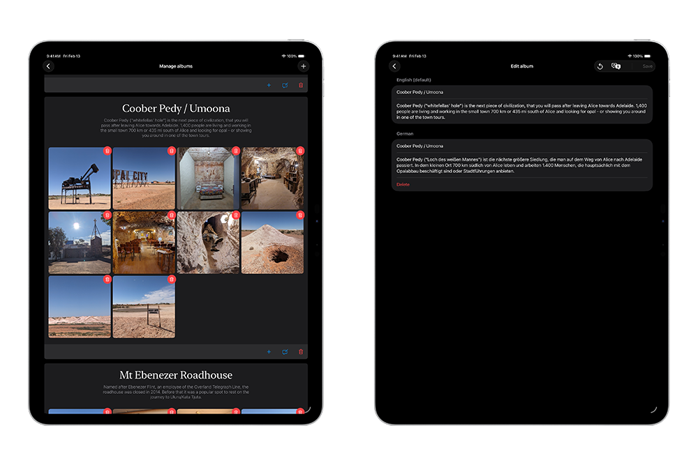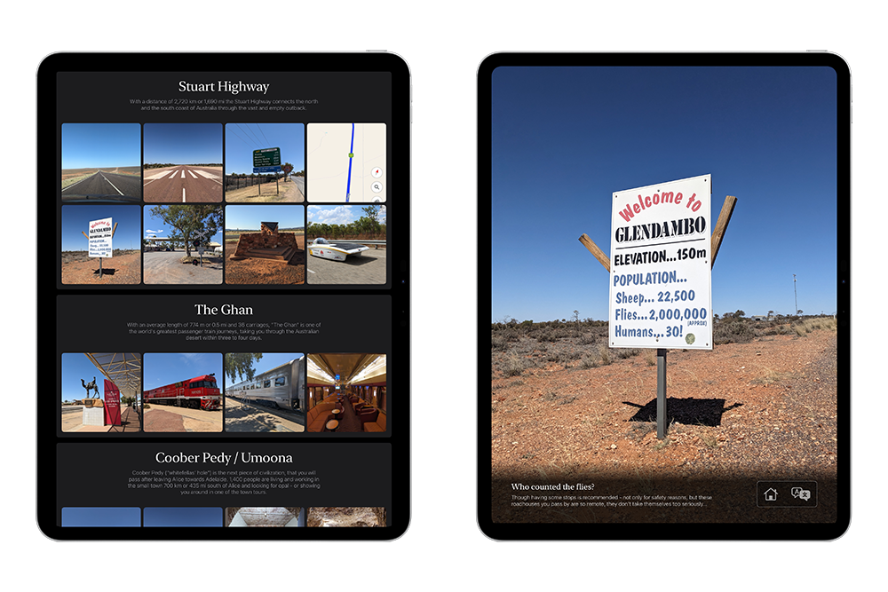 I didn’t just want to present the photos to the group in a lecture format, but also use them to fill a part of the 450-kilometer (sometimes even 800-kilometer) driving distance on a tour, meaning I wanted to be able to pass the iPad around while driving. The images needed to be self-explanatory or include an explanation, since everyone would be looking at the galleries at different times. At the same time, I was looking for a way to ensure that guests only saw these galleries and no other personal data on the iPad.